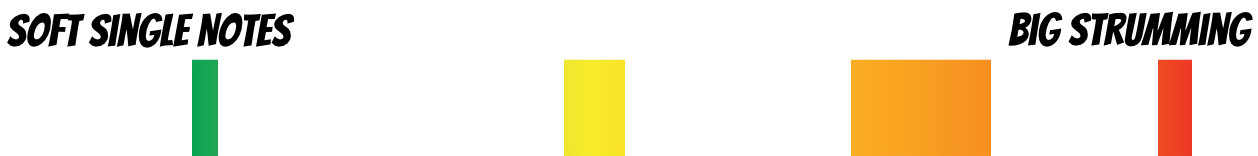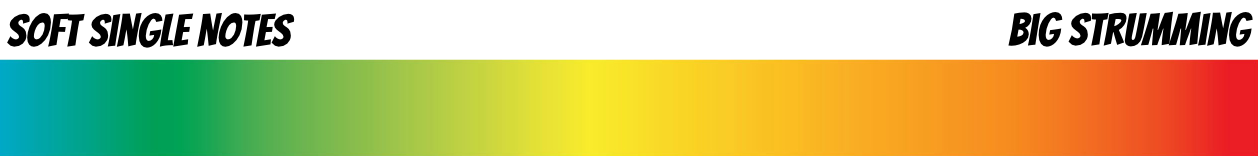 Think of the color spectrum, since we're all familiar with that imagery. Big Strumming is kind of like the hot red zone, and way over on the other side is the softest of single notes.. maybe even just one note played with passion!
